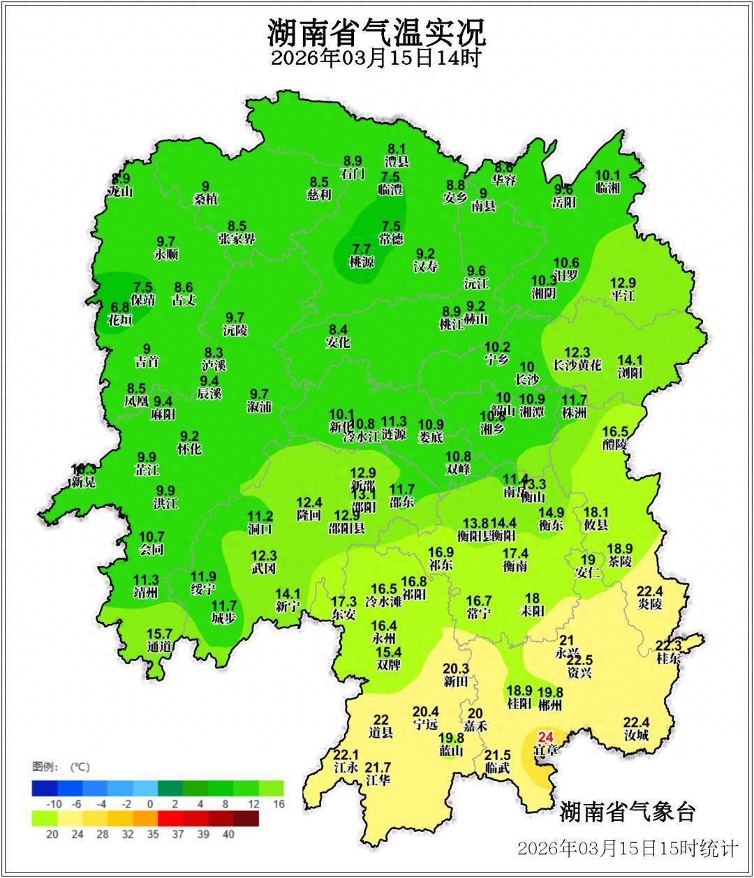 15日晚上至16日白天,湘南南部多云间阴天,其他地区阴天有小到中雨,其中湘西州南部、怀化北部、常德南部、益阳北部、岳阳西北部部分地区大雨;北风2~3级;最低气温湘南9~11℃,其他地区6~8℃;最高气温湘西、湘北8~10℃,湘南南部18~22℃,其他地区11~15℃。
